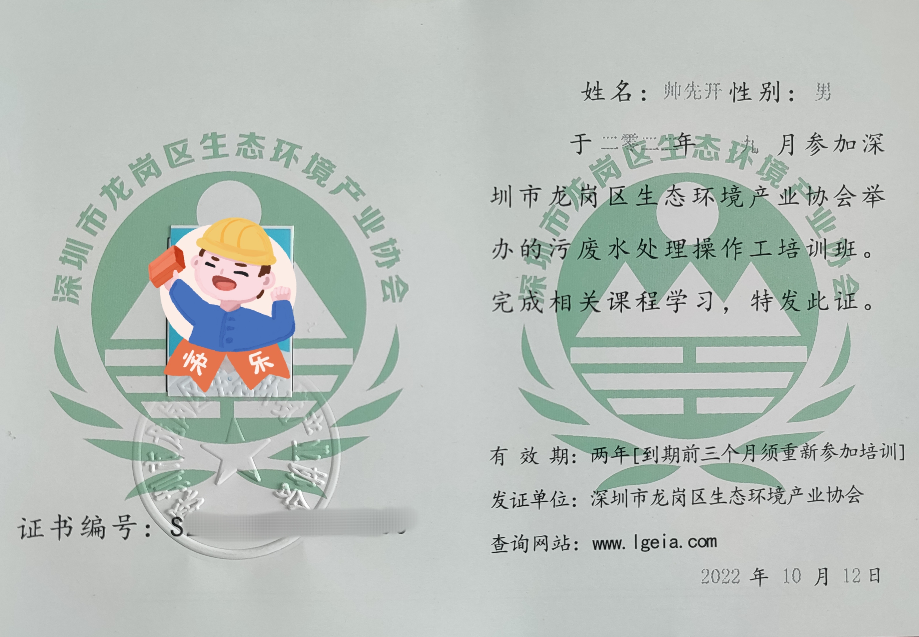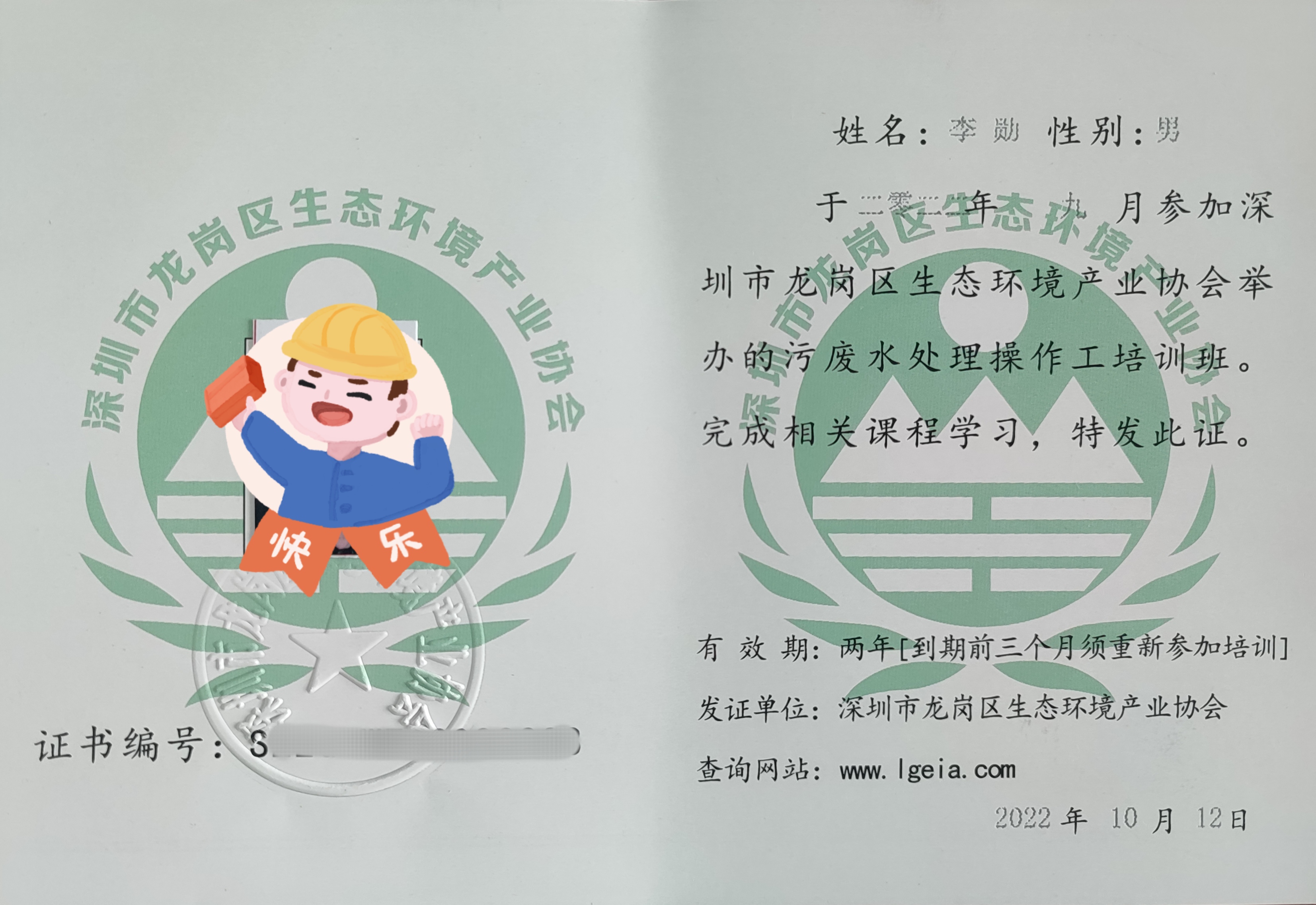 培訓(xùn)收獲 此次培訓(xùn)為期三天,不僅有內(nèi)容的講解,還有污水處理廠實(shí)地考察,讓受培訓(xùn)人員更加直觀地了解污廢水運(yùn)營(yíng)設(shè)施設(shè)備的規(guī)范操作。 (培訓(xùn)證書(shū)) “此次培訓(xùn)讓我對(duì)環(huán)保知識(shí)、相關(guān)技術(shù)操作規(guī)范有了更深的認(rèn)識(shí),不僅提高了我的專業(yè)知識(shí)水平及安全文明生產(chǎn)意識(shí),也讓我的運(yùn)維技術(shù)得到了質(zhì)的提升”?!宜纠顒渍f(shuō)道。