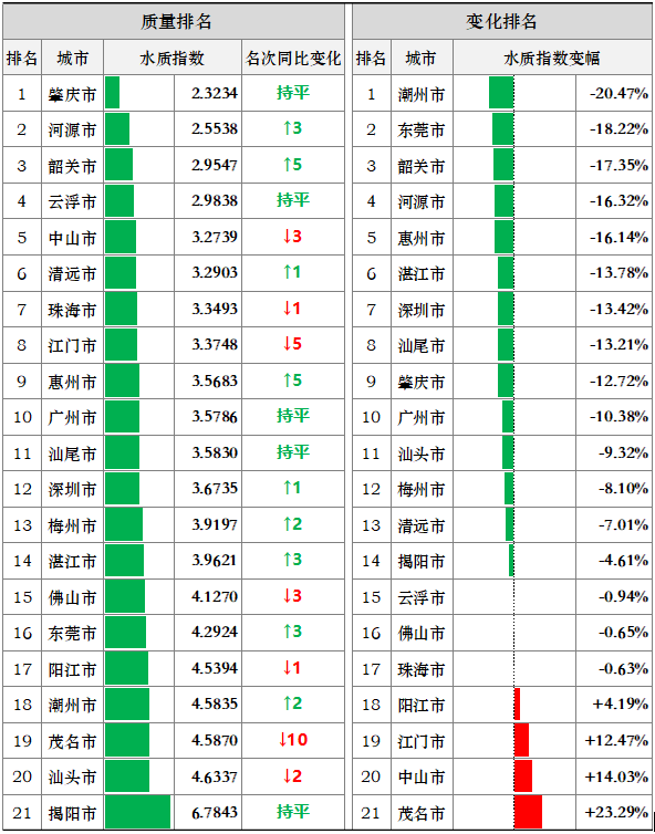 城市排名:149個(gè)國(guó)控?cái)嗝嬷?,城市水質(zhì)指數(shù)排名前三位為肇慶、河源、韶關(guān)市,后三位為揭陽(yáng)、汕頭、茂名市。潮州、東莞、韶關(guān)等17市水環(huán)境質(zhì)量同比有所改善,茂名、中山、江門(mén)等4市同比有所下降。